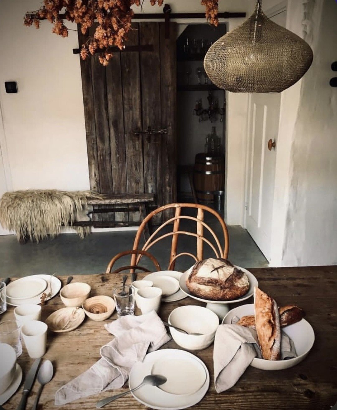 Het is een beleving. De geur die je in de ochtend verwelkomd, wanneer je de keuken binnenloopt. De keuken waar het deeg voor het brood van die dag al staat te rijzen in een grote aardewerk kom. Het grote houtfornuis is het hart van het huis, vaak gesierd met een robuuste ketel met kokend water voor een geurige kop Jasmijn thee. Het ademt rust, puurheid en eenvoud. Gesierd door aardetinten en veel robuust houtwerk. Midden in huis, staat een lange houten tafel. Een tafel met een verhaal. Verhalen van lange avonden genieten met vrienden en familie. Verhalen te lezen in de kringen op het tafelblad, die de glazen wijn en dampende kommen thee hebben achtergelaten. Verhalen van flarden muziek, die nog zachtjes door de ruimte dwalen. Verhalen van het vuur in de houtoven dat nog zachtjes na sist. Of deze tafel nu staat bij de haard, waar een knapperend haardvuur de kamer verwarmd. In de tuinkamer met uitzicht op de Franse tuin, waar je de zon op kunt zien komen. In de tuin waar de grote notenboom ons de nodige schaduw biedt tegen de zomerzon. In de boomgaard waar tijdens de eerste lentedagen de vlinders lustig los dartelen. Of achter in de moestuin in de piepkleine orangerie met boszicht, waar je op een mooie herfstochtend van de geluiden en de veranderende kleuren van het herfstbos kunt genieten.
